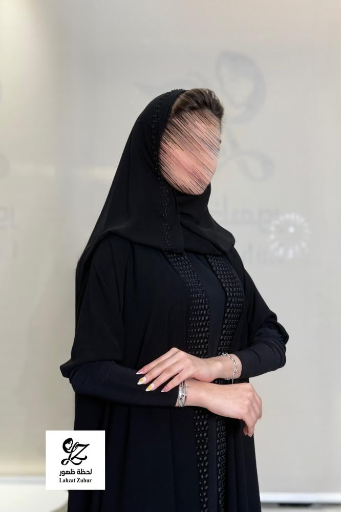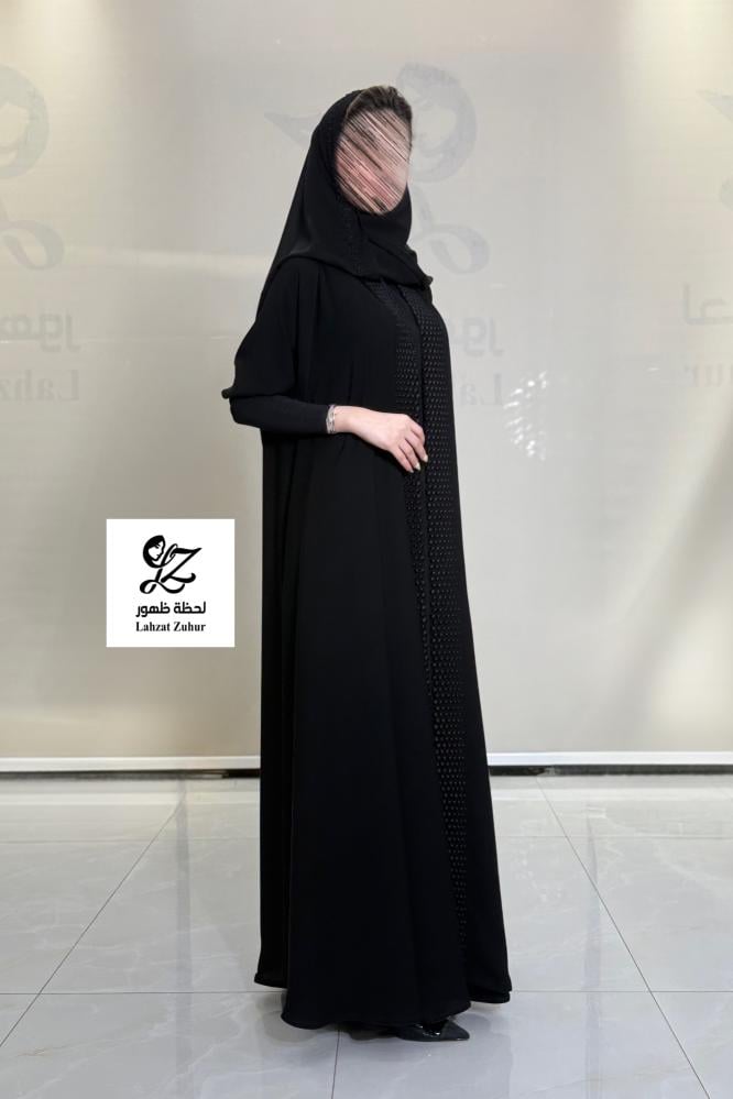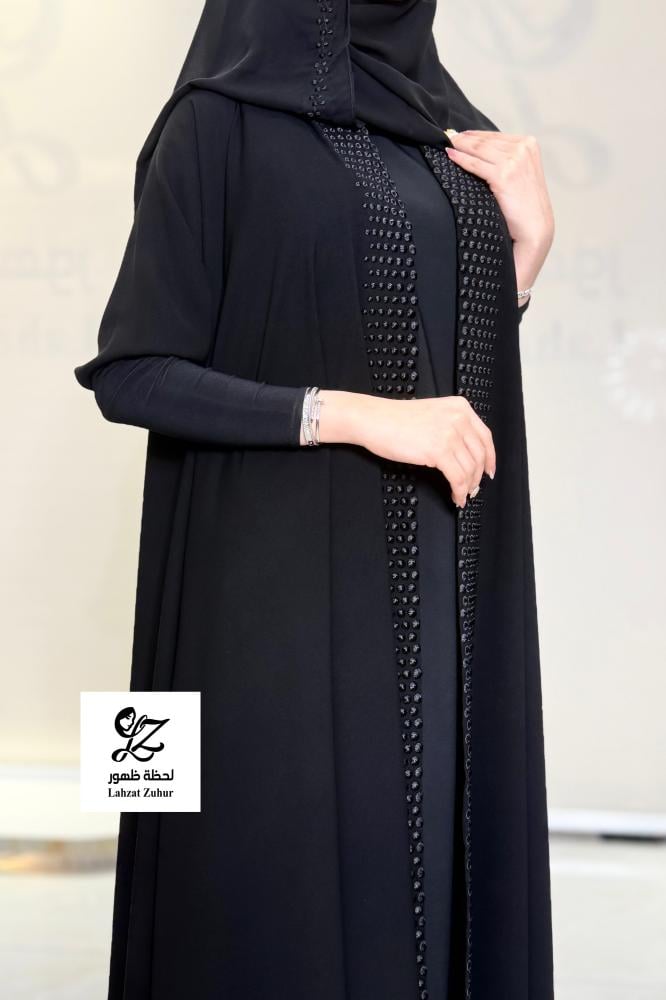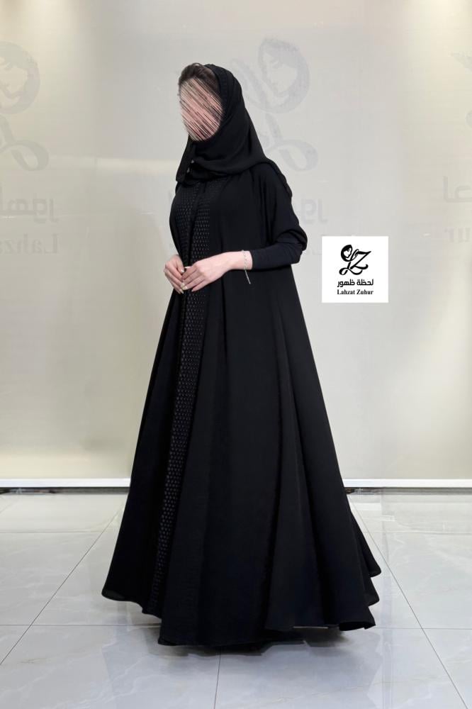 عبايه الماس دبل كلوش بقماش مكلي اسود بتدخيل تطريز يدوي