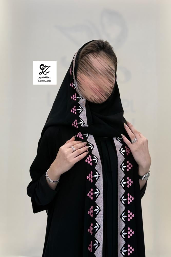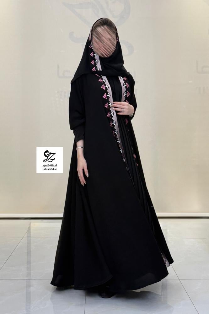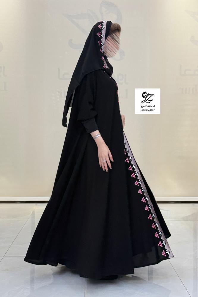 عبايه نجد دبل كلوش بقماش ملكي اسود بتدخيل تطريز ناعم