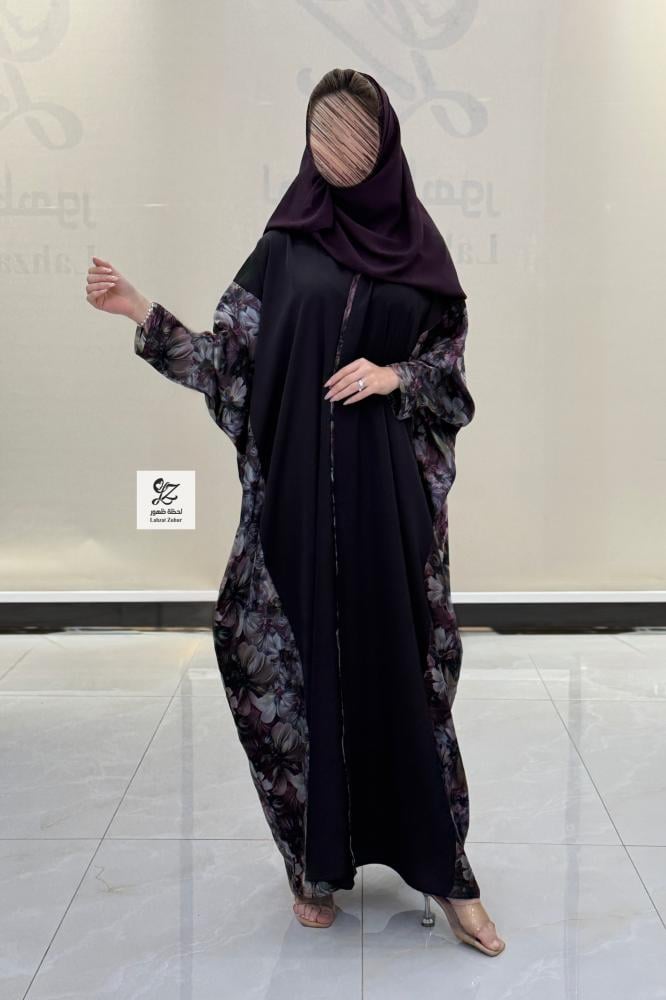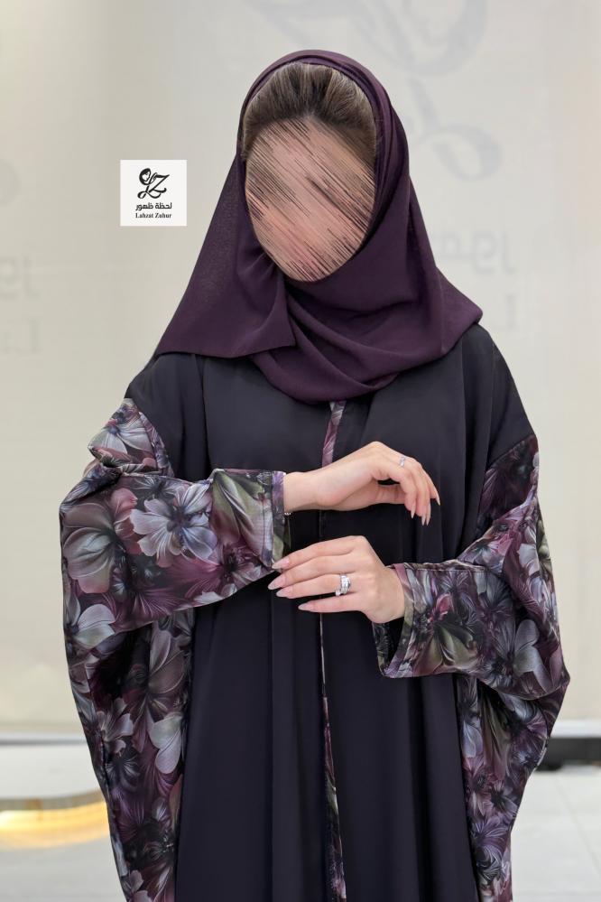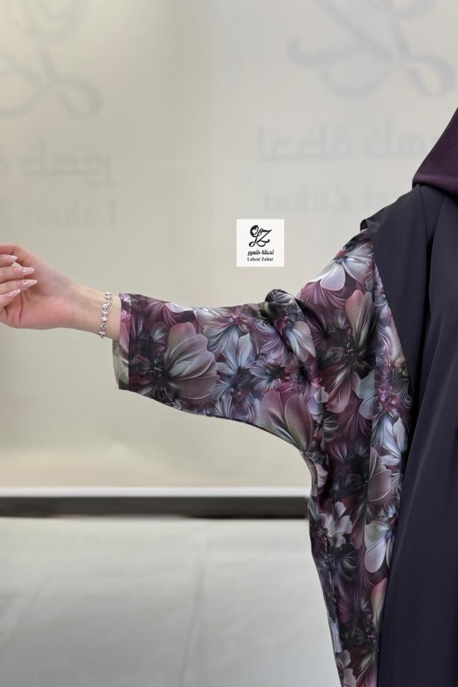 عبايه نص بشت فراشه بقماش حرير بتدخيلات شيفون مشجر لون موف